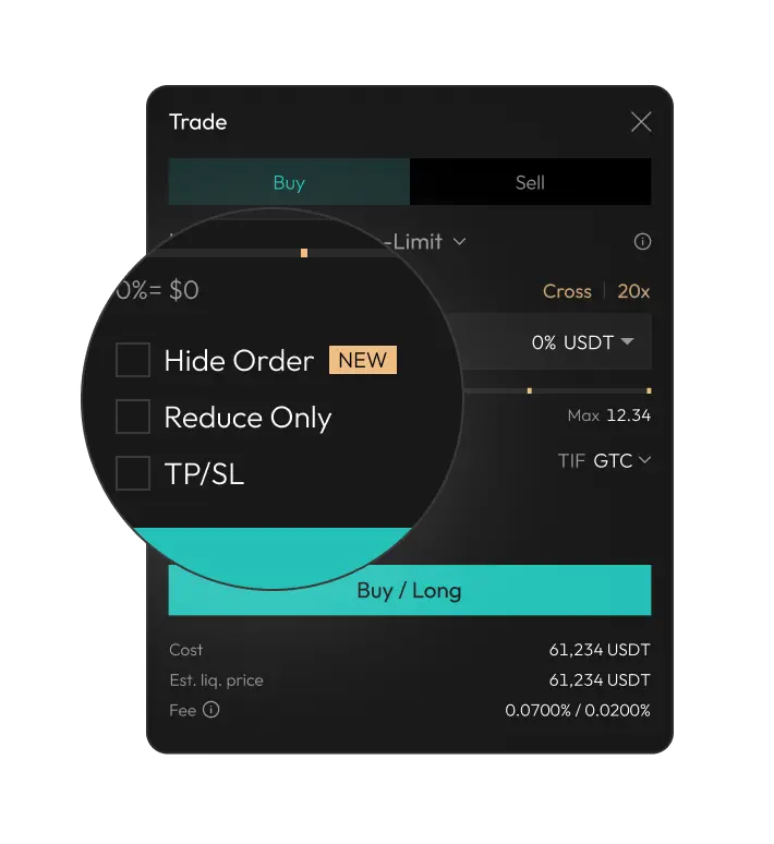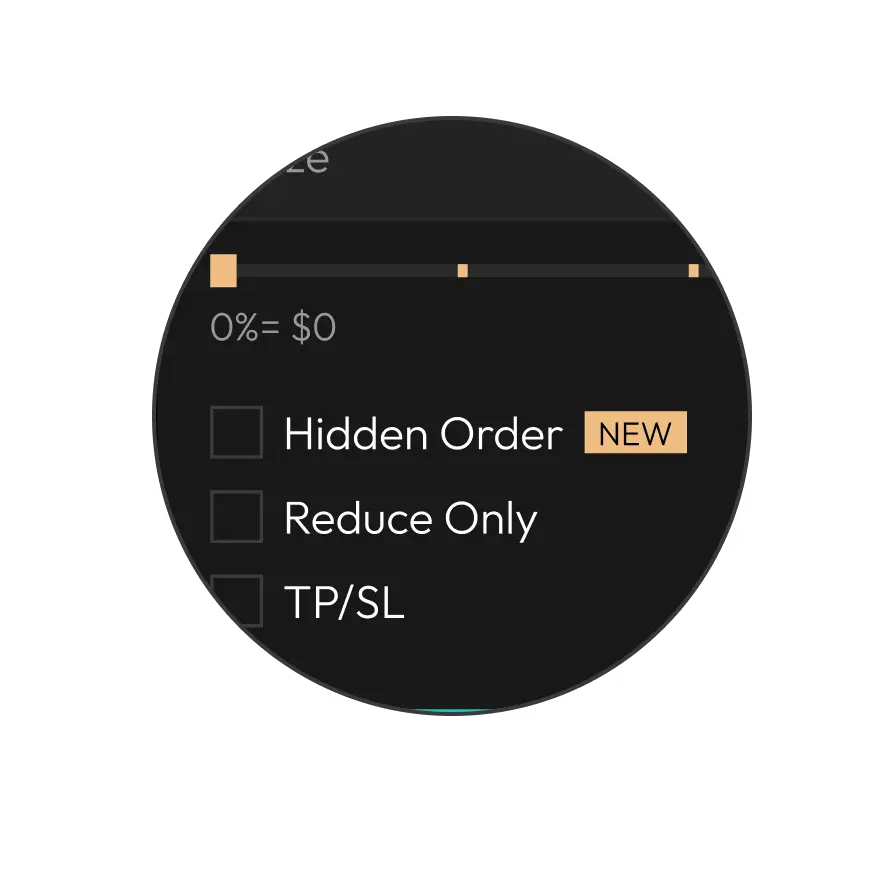 Hidden orders let you place limit orders that stay fully hidden from the public order book — size and direction are not shown.